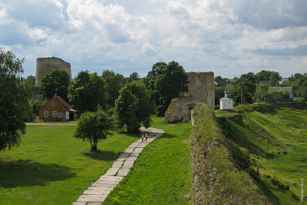 Изборск завораживает. Когда много лет назад мне впервые удалось побывать здесь, дыхание просто остановилось от этих исконно русских пейзажей. Это впечатление возросло, когда над головой поднялись покрытые золотнянкой округлые башни и мшистые розовато-лиловые выступы плиты над оврагом, над которым тянется пустынная стена крепости. А когда из крепости впервые в полуразрушенной арке далеко внизу я увидела узкую серебряную ленту змеящейся речки Смолки, пробирающейся сквозь зелень зарослей к Городищенскому озеру, и вихрастые ветлы у деревянного мосточка, и вползающую в гору, извивающуюся .словно река, Старую Псковскую дорогу, и холмы, и поля, и пестреющие стада с крошечными коровками и овечками — захотелось полететь…