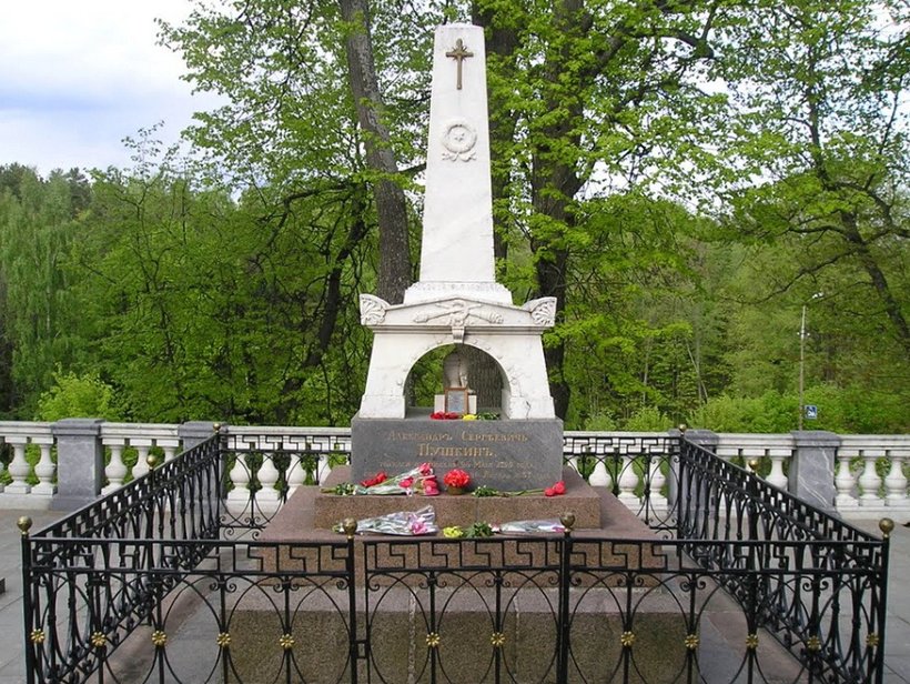 Собор прост и крупен. Он выстроен в древней народной традиции, но гигантское подножие холма делает его необычайным, вознося над окрестностью. У его строгих беленых апсид погребено горячее сердце России, ее великий поэт. На изящном памятнике, увенчанном невысоким беломраморным обелиском, написано: «Александр Сергеевич Пушкин, родился в Москве 26-го мая 1799 года, скончался в С.-Петербурге 29-го января 1837 года». Прах его лежит рядом с прахом его предков. Здесь погребены его дед, неистовый Иосиф Абрамович Ганнибал, его бабка Мария Алексеевна Ганнибал, урожденная Пушкина, и его мать, а в соборе — его маленький братик. Здесь в 1836 году, похоронив мать, он купил место для себя, словно предчувствуя свою близкую гибель.