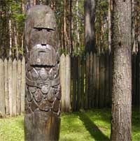 Экспозиция «Славянский мифологический лес» открыта в 1997году. Надо сказать, что христианство на Руси внедрялось столь рьяно, что мало кто из нас знает что-то о верованиях наших предков язычников. Тем более ценна работа, проведенная работниками музея. Здесь реконстуирована капище (место для проведения обрядов). Одним из интереснейших языческих святилищ является святилище Перуна близ Новгорода Великого в урочище Перынь на озере Ильмень.